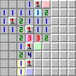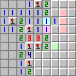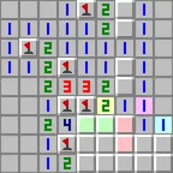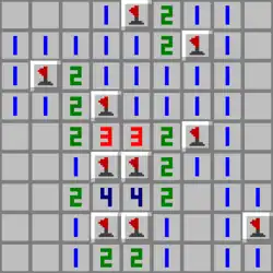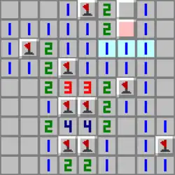 A player selects a cell to open it. If a player opens a mined cell, the game ends. Otherwise, the opened cell displays either a number, indicating the number of mines vertically, horizontally or diagonally adjacent to it, or a blank tile (or "0"), and all adjacent non-mined cells will automatically be opened. Players can also flag a cell, visualised by a flag being put on the location, to denote that they believe a mine to be in that place.[1] Flagged cells are still considered unopened, and a player can click on them to open them.[2] In some versions of the game when the number of adjacent mines is equal to the number of adjacent flagged cells, all adjacent non-flagged unopened cells will be opened, a process known as chording.[2]