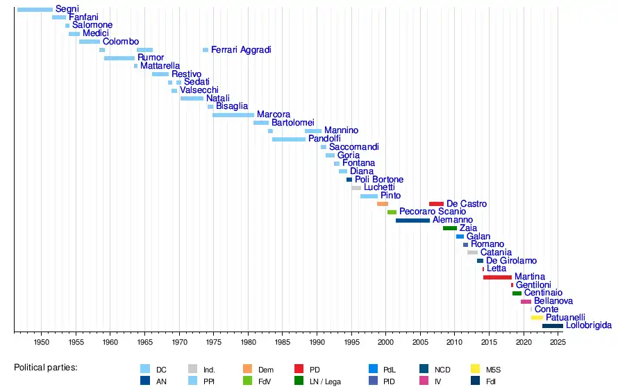 22 October 2022 | Incumbent | 2 years, 301 days | Brothers of Italy | Meloni | ||