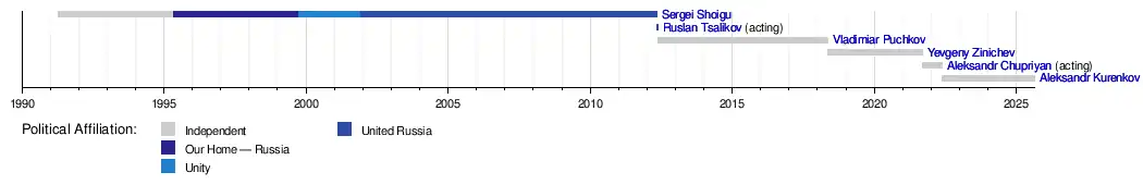 The minister of emergency situations, like other presidential ministers, is nominated and appointed by the president after consultation with the Federation Council (whereas non-presidential ministers are nominated by the prime minister and appointed by the president after approval by the State Duma). The current minister of emergency situations is Aleksandr Kurenkov[1]
