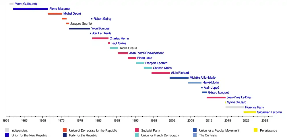 Pierre Guillaumat | 8 January 1959 | 5 February 1960 | 1 year, 28 days | Debré | Charles de Gaulle | [31] | |