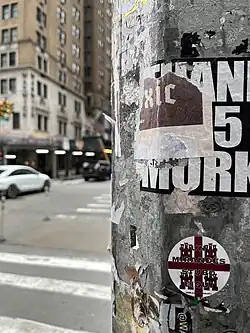 A sticker located in New York City, displaying the Mirandese text "Un mirandés stubo eiqui" A Mirandese (person) was here. Displaying an unofficial proposed flag for the Mirandese people behind the text.