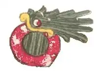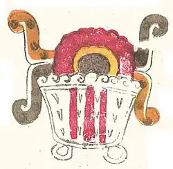 Mirrors were also associated with water; an Early Classic mirror in the style of Teotihuacan was excavated at distant Guácimo area of the Limón province near the Caribbean coast of Costa Rica. It included Teotihuacan imagery that was a stylised convention for representing bodies of water.[14] Water imagery continued to be associated with mirrors in central Mexico right up to Aztec times.[15] These representations of water-associated mirrors in Mesoamerican art apparently use the mirror to symbolise the surface of a pool of water. During the Classic Period mirrors were placed in bowls to symbolically represent bowls of water; examples are known from Teotihuacan and throughout the Maya area. Water-filled bowls have been used as mirrors for divinatory purposes right up to modern times in Mesoamerica and the American southwest. An incense burner from Early Classic Escuintla on the Guatemalan Pacific slope combines butterfly and water imagery. The mirror has flanking ears representing the wings of the butterfly that is rising from a water-filled bowl.[14]