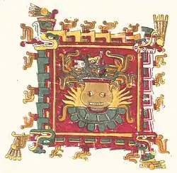 Mirrors are represented in association with fire in two codices of the Borgia Group from central Mexico during the Aztec period (Codex Borgia and Codex Vaticanus B). The mirrors are placed with censers that serve as hearths for the fire goddess Chantico. Another scene from the Codex Borgia depicts a burning Toltec-style mirror used as a hearth for a sizeable pot. The mirror-hearth and pot are framed by four fire serpents. On another page of the same codex, the god of fire Xiuhtecuhtli is making fire from a mirror placed on the back of a fire serpent.[57] An Aztec sculpture of a seated figure bears a smoking mirror on its back to represent the fifth sun.[22] The iconography of the Aztec sun stone closely conforms to that of Postclassic turquoise mirrors; and is based upon the design of earlier Toltec pyrite mirrors.[83]