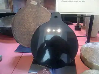 Tomb A at La Venta is one of the oldest formal tombs in Mesoamerica, dating to about 600 BC.[40] Among the funerary offerings of this elite burial was a highly polished magnetite mirror; it also contained the figurine of a seated female who wears an obsidian mirror on her chest.[41] A total of seven concave mirrors were excavated from Complex A at La Venta; they were fashioned from hematite, ilmenite and magnetite.[42] These are counted as among the most outstanding examples of iron ore workmanship that the Olmecs produced. Their concave fronts are as precisely ground as modern optical lenses, although their backs were left rough and uneven.[43] The concave lenses of these mirrors were found to form parabolic reflectors. The borders of each of the La Venta mirrors formed a circle or an ellipse, and they usually had different focal lengths for each axis.[36] The three iron ores used are the best available minerals to produce durable highly reflective mirrors with a non-tarnishing metallic surface.[36] All of these mirrors had drilled holes near their edges and were probably worn as chest ornaments since many Olmec figurines depict such mirrors being worn.[44] The concave lenses of some of these iron ore mirrors are able to project camera lucida images onto a flat surface and can also be used to light fires.[45] The grinding of the concave surface was done manually, probably using powdered iron ore as an abrasive. Similar mirrors were not only found at San Lorenzo but also at Río Pesquero and as far as Guerrero on the Pacific Coast of southwestern Mexico.[44] The Olmecs never used iron pyrite in their concave mirrors, presumably because it degrades with time.[36] Mirrors were among the ritual paraphernalia used by Olmec priests, shamans and rulers;[46] the Olmecs closely identified mirrors with the sun.[10]