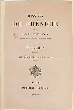 The Mission de Phénicie was the first major archaeological mission to Lebanon and Syria. It took place in 1860-61 by a French team led by Ernest Renan. Renan was entrusted with the mission in October 1860, after French interest had been sparked by the 1855 discovery of the Sarcophagus of Eshmunazar II.[1]