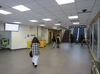 Buses use the upper level, while access from the mall is through the lower level via a signalized crosswalk (no indoor connection), where a taxi stand and kiss and ride are located. Services provided on the upper level of the building include ticket sales, information booth, and lost and found, while washroom facilities and MiWay transit police holding cells are located on the lower level. The terminal is accessible by both elevator and escalator.