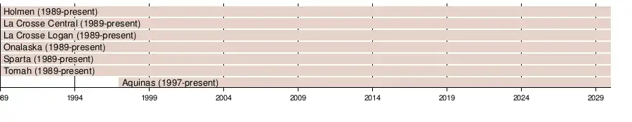 The Mississippi Valley Conference was formed in 1989[1] to accommodate for the growing attendance in schools in traditional rural-based conferences and shorten travel distances for its members.[2] Holmen and Onalaska joined from the Coulee Conference, Sparta and Tomah from the South Central Conference, and La Crosse Central High School and Logan High School from the Big Rivers Conference. Shortly after, in 1997, Aquinas High School joined from the Central Wisconsin Catholic Conference of the Wisconsin Independent Schools Athletic Association, a private school athletic league, to become the conference's seventh member.[3] It is the second high school athletic conference in Wisconsin to carry this name, the previous incarnation was based in west central Wisconsin and was in existence from 1933 to 1965.