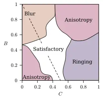 Various artifacts may result from certain choices of parameters B and C, as shown in the following illustration. The researchers recommended values from the family (dashed line) and especially as a satisfactory compromise.[1][4]