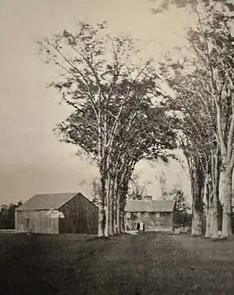 Built in 1728, on the town's lot number 91,[2][3] it stood at the rear of today's Holy Cross Cemetery on a bluff around 50 feet (15 m) immediately above the Royal River. It was used as a blockhouse, within a stockade, during the Indian wars. A tunnel was built from the home's cellar to the river. The dirt path that looks like it leads to the water is actually the town's original stage road, formerly lined with elm trees. As North Yarmouth's stagecoach travel increased in popularity, the stockade was removed and the home was enlarged to accommodate overnight guests. The original structure was made of clapboard; the extension, added on the northern side, was clad with shingles.[4]