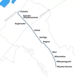 The Mizuma Line (水間線, Mizuma-sen) is a Japanese railway line between Mizuma Kannon Station and Kaizuka Station, all within Kaizuka, Ōsaka. This is the only railway line of the private railway company Mizuma Railway (水間鉄道, Mizuma Tetsudō), which also operates bus services.