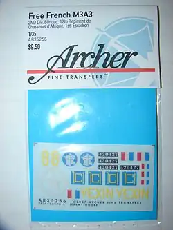 Aftermarket markings are also available. Firms such as Archer Dry Transfers or Decalomaniacs produce stand-alone sheets of wet or dry transfer markings to allow the modeler to complete a different or more accurate variant.