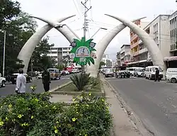 Moi Avenue is known for the Mombasa tusks, two pairs of giant aluminium elephant tusks crossing the dual carriageway. The tusks were commissioned in commemoration of a visit to Mombasa by Queen Elizabeth in 1952 and have remained since that time. Initially the lower part of the tusks were illegally used for advertisement, but after the city council enforced strict laws the landmark has remained in its original form ever since.