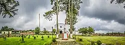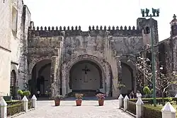 The monastery of San Juan Bautista in Tetela del Volcán was built by the Dominicans in the first half of the 16th century and was even visited by Hernán Cortés.[11] It is at a high altitude near the volcano surrounded by pine forest in a relatively cold climate.[6][14] The exterior has arcades that surround the complex but are partially hidden by trees.[14] The upper parts of the walls around the complex are covered in paint; the lower floor of the cloister has figures depicted in the arches and walls. Many are of Augustinian monks. In the vaults over the walkways, there are numerous cherubs which are defeating evil spirits and some are even fighting with each other.[4] One unique architectural element is the Moorish-style wood-beam roofing in the sacristy.[6] There is a crafts market held here each Wednesday.[14] The atrium have a series of frescos of very high quality, painted by a local indigenous artist in the 16th century.[15] They were restored in 2008.[16]