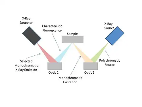Monochromatic wavelength dispersive x-ray fluorescence (MWD XRF) is an enhanced version of conventional wavelength-dispersive X-ray spectroscopy (WDXRF) elemental analysis. The key difference is that MWD XRF uses a doubly curved crystal X-ray optic between the X-ray source and the sample resulting in monochromatic excitation.[1][2] This additional optic creates a high-intensity X-ray beam on a small spot size without increasing the power of the X-ray source. An MWD XRF instrument is constructed from a low-power X-ray tube, a point-to-point focusing optic for excitation, a sample cell, a focusing optic that collects the fluorescence from the sample, and an X-ray detector. By using an optic between the X-ray source and the sample, a monochromatic beam free of bremsstrahlung, excites the sample, eliciting the secondary fluorescence X-rays needed for elemental analysis. By restricting the band of wavelengths used for excitation, a much higher signal to background ratio is achieved. This type of excitation allows much lower limits of detection and faster reading times.[3]