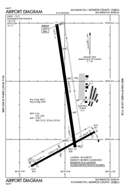 Monroe County Airport (IATA: BMG, ICAO: KBMG, FAA LID: BMG) is a county-owned public-use airport located four nautical miles (7 km) southwest of the central business district of Bloomington, a city in Monroe County, Indiana, United States.[1] Commercial service has been available at different points in the airport's history but as of today and for the future , no scheduled service is available.