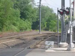 A short distance after Montclair State University, the tracks turn to the northwest, leave campus grounds and cross over Clove Road. The tracks loop around campus and pass Great Notch Yard and the site of the now-closed Great Notch station. Great Notch was a one platform station in the Great Notch district of Little Falls. The station consisted of a shelter (which replaced a building built in 1905[11] and burned down in 1988[49]) and benches. After ridership at the station became "anemic",[32] Great Notch was shut down on January 17, 2010,[37] with the last train departing two days prior. Great Notch and its Yard serve as the end of the electrified catenary wires above on the Montclair-Boonton Line.[11] This station was also the site of the transfer to the Erie's Caldwell Branch to Essex Fells, New Jersey,[50] torn up in 1979.[51]