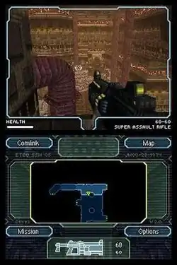 Moon features first-person shooter gameplay and full 3D environments that the player can explore. Over the course of the game, the player can collect a variety of weapons to fight enemies. The game has three difficulty modes and is presented in multiple episodes with checkpoints scattered throughout each one. The upper screen of the DS displays the player's view of the environment, while the lower screen displays menu commands and a real-time map.[5] The game's story will be revealed as the player progresses through each level with pre-rendered cutscenes, text logs accessible through computer terminals, and communications with the player character's superiors. Much of the fighting the player experiences takes place in narrow corridors, although the developer has mentioned that the updated game engine allows for wide-open environments and large groups of enemies. The game does not feature any multiplayer mode, with the focus of the game being the single-player campaign.[4]