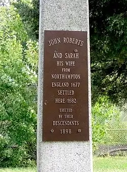 In 1682, John and Sarah Roberts became the first English-speaking residents of Moorestown when they established their home. Their residence is now marked by the Roberts Monument at the intersection of County Route 537 and Route 73.[29][30] In May 1686, three years after the founding of Philadelphia, John Rodman bought 500 acres (2.0 km2) on the west side of Chester Township, and Thomas Rodman bought 533 acres (2.2 km2) in the same area; this soon became known as the Village of Rodmantown. The growing area around the eastern spring was known as the Village of Chestertown.[31]