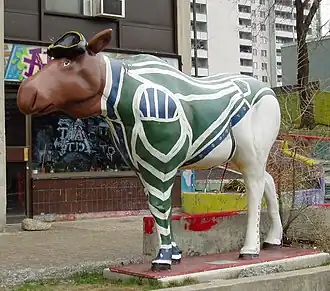 Lost Moose, one of the statues sponsored by BMW, was moved to Whitby to avoid the vandalism in Toronto, stationed at the entrance of Iroquois Park.[18] During the 2000 Summer Olympics in Sydney, Australia, Aline Chretien officially opened a bar on Cockle Bay Wharf, to try and shake "Canada's reputation as a slightly dull—if clean and safe—place." Featured was vodka-based "moose juice", and Lastman was expected to appear.[6] A few moose from the Moose in the City program were displayed in Darling Harbour, just west of the downtown, at "Moose Lodge".[19] One eventually made its way to Bermuda.[20] One of the Moose, the Tourist moose, ended up at 1405 Denison Street outside an industrial building in Markham, Ontario.[21]