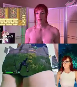 In March 2024, Morgpie experimented with another meta, wearing a monochrome outfit and using her body as a green-screen.[15] She made particular use of her buttocks as the green-screen projection area, such as in one stream where she reacted to a video by fellow streamer Cr1TiKaL.[16] Debuting the style on March 12, she further propelled the meta's popularity a couple of days later following a Fortnite stream, with her gameplay overlaid on her buttocks.[17][18] In another stream, she used a green-screen cut-out shirt, causing her head and breasts to be the only visible parts of her body.[18] Like with the topless meta, this style of content proved to be controversial and led to a ban on "content that focuses on intimate body parts for a prolonged period of time" going into effect on March 29.[18]