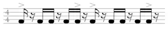 The melodic line of the morna varies a lot through the song,[5] with ascending and descending note sequences, and within a bar the notes generally do not have the same length. One frequent characteristic of the morna is the syncopation, more precisely, one note at the end of a bar is extended to the strong beat of the next bar. The melody is accentuated on the first beat and the last half-beat of the bar.