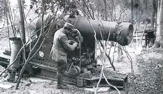 At the outbreak of the First World War, it is estimated there 32 mle 1885's available. For transport the mle 1885 could be broken down into four wagon loads for horse or motor traction. The mortars could also be transferred to 600 mm (1 ft 11+58 in) narrow gauge rail wagons for the final leg to their firing positions.[4] These narrow gauge tracks were also used to re-position the mortars and bring up their ammunition and supplies. Site preparation needed up to 15 men directed by 2 officers and took 7-8 hours. Site preparation included creating a base of wooden beams then assembling the mortar with cranes and block & tackle.[3]