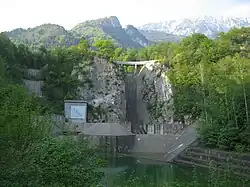 Moste is the location of the Moste Hydroelectric Plant, the first hydro-electric power plant to have been built on the Sava Dolinka River. It has a 60-meter (200 ft) high dam (the highest dam in Slovenia to date) in the Kavčke Gorge,[2] right before the Sava is joined by the Radovna. The plant was built using forced labor by political prisoners from camps set up after the Second World War.[3]
