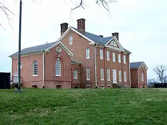 Mount Clare features a portico on the front façade with a projecting bay above. The upper bay contains a Palladian window. The City of Baltimore built Palladian pavilions connected by hyphens on either side in 1910 as a concealed public toilets structure,[5] but these do not reflect historical construction that were originally on the estate.[4] They have since been converted to a library and a colonial-era kitchen exhibit.[5] A circa 1912 stable,[6] once used to house the horses of the city's park rangers, has been restored and is now used for classroom space as well as a rental facility for events and meetings.
