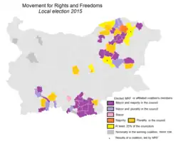 Map showing performance of MRF at the 2015 Bulgarian local elections.