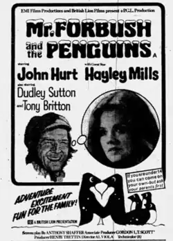Mr. Forbush and the Penguins (also known as Cry of the Penguins) is a 1971 British comedy drama film, directed by Arne Sucksdorff, Alfred Viola and Roy Boulting. It stars John Hurt, Hayley Mills, Dudley Sutton and Tony Britton.[3] The screenplay was adapted by playwright Anthony Shaffer, based on the 1965 novel Forbush and the Penguins by Graham Billing.