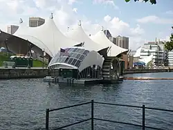 Mr. Trash Wheel is a moored vessel that removes trash from the mouth of the Jones Falls stream at Baltimore's Inner Harbor.[1][2] Rubbish from the streets of Baltimore flushes into storm drains that empty into Jones Falls. The floating trash is then carried by the river to its outlet into the Inner Harbor, where it is captured by Mr. Trash Wheel.[3] The water wheel can be controlled remotely on the Internet.[4] Mr. Trash Wheel was constructed using $720,000 of public and private funding.[4]