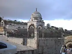 Mujir al-Din died in 1522.[2] He was buried at the base of the Mount of Olives just outside the walls of the Old City, a little to the north of the Church of Gethsemane and right in front of the Tomb of Mary.[12] His tomb, with its open four-columned structure covered by a dome, lies next to the sidewalk on the main road and there are steps leading down from it on both sides to the Tomb of the Virgin.[4][13]