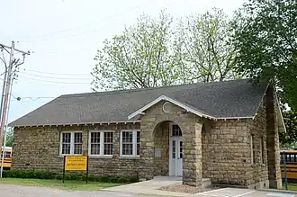 The Mulberry Home Economics Building is a historic school building in Mulberry, Arkansas. It is a single-story stone and masonry structure, located off West 5th Street behind the current Mulberry High School building. It has a rectangular plan, with a gable-on-hip roof and a projecting gable-roof entry pavilion on the north side near the western end. The pavilion exhibits modest Craftsman styling, with exposed rafters in the roof and arched openings. The south facade has a secondary entrance near the eastern end, and four irregularly sized and spaced window bays to its west. The building was erected in 1939 with funding assistance from the National Youth Administration.[2]
