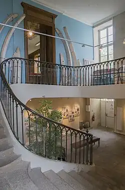 The Demarie-Valentin House was built by Jean-François Demarie around 1800 on the site of the former parish church of Saint-Michel-du-Tertre, destroyed during the Revolution. The interior layout of the Demarie-Valentin House is surprisingly unique in its neoclassical style: through the front door, a high staircase leads on to a round courtyard dominated by a circular balcony. The garden vestibule connects two octagonal rooms together, each in its turn giving passage toward wings embracing the garden; a colonnade lends the garden façade an "antique" allure. Bequeathed to the city of Angers by its last owner in 1958, the house was used to host the zoology collections.[10][11] This building houses the museum's reception desk, the laboratory of taxidermy-restoration and part of the reserves. The Demarie-Valentin House has been registered as a national heritage site (Monument historique) since 28 August 1995.[1]