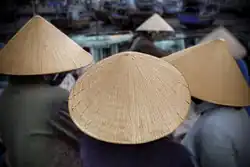 Nón lá (chữ Nôm: 𥶄蘿; lit.'Leaf hat') or nón tơi (𥶄𥵖) is a type of Vietnamese headwear used to shield the face from the sun and rain.[1] It is a common name for many types of hats in Vietnam, but now it is mainly used to refer to cones with pointed tips.