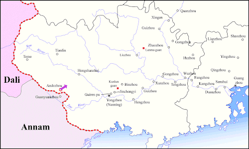 In 1041, Nong Zhigao and his mother seized Dangyouzhou (modern Jingxi, Guangxi) and the Leihuo grotto settlement (modern Daxin County).[22] A Nong married a wealthy merchant but Zhigao murdered this man. A Nong married a third time to Nong Xiaqing, expanding their territory further into Temo.[23] In 1042, Zhigao declared the founding the Kingdom of the Great Succession (Dali Guo 大歷國, not to be confused with the Kingdom of Dali 大理).[24] Đại Cồ Việt sent troops and captured him. He was held prisoner for a year before he was released with an honorary title and given control of Guangyuan, Leihuo, Ping'an, Pinpo, and Silang in return for a share of their natural resources, particularly gold.[25] In 1048, Zhigao declared another state, the Kingdom of the Southern Heavens (Nantian Guo), and took a reign title, "Auspicious Circumstances" (Jingrui). He called the Viet court's actions criminal and that his territory would not be annexed by China.[26] In the fall of 1049, Zhigao's forces pillaged Yongzhou.[27] In 1050, Đại Cồ Việt launched an attack on Zhigao's stronghold and evicted him, sending him fleeing into Song territory.[28]