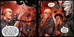 Soon afterward, N'Kantu was seen as one of the heroes against the Super-hero Registration Act which was forged during the "Civil War" event; it is later explained that N'Kantu began to feel his service in the Howling Commandos was slavery, prompting his rebellion.[11] He was apprehended and transported to an extra-dimensional prison called "Fantasy Island" which is located in the Negative Zone. He was transported to his cell alongside Coldblood, Speedball, and Typeface. During this time, N'Kantu informs the three that he is not alive, unnerving them in the process.[12] When Iron Man and Spider-Man visit N'Kantu he is in his prison cell, secured to a slab and surrounded by flames; Iron Man stated that some detainees require special security measures.[13] He was later released when Hulkling impersonated Hank Pym and used his voice to unlock all the cells of imprisoned heroes.[14] N'Kantu then takes part in the end fight between the Pro-Registration forces and the Anti-Registration forces.[15]