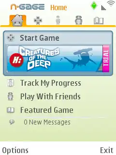 The N-Gage client app functioned as an app store, software updater, instant messaging client, and personal achievement record.[44] Nokia was inspired by Microsoft’s Xbox Live service in creating the user interface[45] of the app. At the top of the N-Gage launcher are five tabs for each function. The My Games screen shows all the games that are currently installed on the phone. The Profile tab displays the user's profile, showing how many N-Gage points the user scored scored, their reputation level (ranging between 1-5 stars), the number of friends they have, and their avatar/picture. Users could also track progress through trophies/achievements.[45]