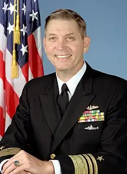 Nils Ronald "Ron" Thunman (born 26 February 1932) is a retired vice admiral in the United States Navy. Thunman is the son of Swedish immigrants, and was raised in Springfield, Illinois, where he attended Springfield High School. During high school he played football, basketball and was in involved in track. After high school, he briefly attended the University of Illinois College of Civil Engineering.[1] He graduated from the United States Naval Academy in 1954.[2] Initially trained as a surface warfare officer, Thunman was given command of the patrol boat USS Marysville in 1957. Transferring to submarines, he became chief engineer on USS Volador. After receiving nuclear power training, Thunman served as executive officer of USS Snook (1964 to 1966), commanding officer of the attack submarine USS Plunger (1968 to 1971) and commanding officer of ballistic missile Submarine Squadron 15 based in Guam (1974 to 1976).[3][4] Notable commands he later held include Commander, Submarine Forces Pacific (1979 to 1981),[5] Deputy Chief of Naval Operations for Submarine Warfare (1981 to 1985) and Chief of Naval Education and Training (1985 to 1988).[6] He retired in 1988.