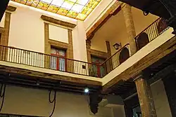 The tezontle stone façade of the current building dates from 1775, and at the peak above the main door is the coat of arms of the Count of Regla.[3] In the main doorway there is the coat of arms of Mexico and a bust of Don Pedro Romero de Terreros. The inside of the building has been completely modified except for a few details. The third floor was added in 1948.[4] What had been Cortés's accounting room while he was the Marquis of the Valley of Oaxaca, became a chapel and remained so until 1926. Since then, it has been a museum, housing painting by José de Páez from 1775, building decorations from the 18th and 19th centuries, cancellation stamps, paper money and certificates from 1880 and the building's original statues.[1]