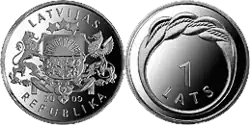 On June 8, 2009, the Bank of Latvia issued a new coin of 1 Latvian lats with the Namejs ring, which encloses the numeral 1, on the reverse.[8] It was legal tender in the Republic of Latvia until the adoption of the Euro currency in 2014.