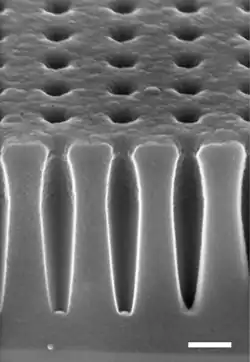 Nanoholes are a class of nanostructured material consisting of nanoscale voids in a surface of a material. Not to be confused with nanofoam or nanoporous materials which support a network of voids permeating throughout the material (often in a disordered state), nanohole materials feature a regular hole pattern extending through a single surface. These can be thought of as the inverse of a nanopillar or nanowire structure.