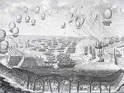 Napoleon also seriously considered using a fleet of troop-carrying balloons as part of his proposed invasion force, and appointed Sophie Blanchard as an air service chief, though she said the proposed aerial invasion would fail because of the winds.[4] (France's first military balloon had been used in 1794 by Jean-Marie Coutelle.)[5] Though an aerial invasion proved a dead-end, the prospect of one captured the minds of the British print media and public.