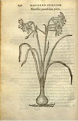 The genus Narcissus was well known to the ancient Greeks and Romans. In Greek literature Theophrastus[26] and Dioscorides[27] described νάρκισσος, probably referring to N. poeticus, although the exact species mentioned in classical literature cannot be accurately established. Pliny the Elder later introduced the Latin form narcissus.[28][29][30][31] These early writers were as much interested in the plant's possible medicinal properties as they were in its botanical features and their accounts remained influential until at least the Renaissance (see also Antiquity). Mediaeval and Renaissance writers include Albert Magnus and William Turner, but it remained to Linnaeus to formally describe and name Narcissus as a genus in his Species Plantarum (1753) at which time there were six known species.[1][32]