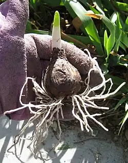 The pale brown-skinned ovoid tunicate bulbs have a membranous tunic and a corky stem (base or basal) plate from which arise the adventitious root hairs in a ring around the edge, which grow up to 40 mm in length. Above the stem plate is the storage organ consisting of bulb scales, surrounding the previous flower stalk and the terminal bud. The scales are of two types, true storage organs and the bases of the foliage leaves. These have a thicker tip and a scar from where the leaf lamina became detached. The innermost leaf scale is semicircular, only partly enveloping the flower stalk (semisheathed). (see Hanks Fig 1.3). The bulb may contain a number of branched bulb units, each with two to three true scales and two to three leaf bases. Each bulb unit has a life of about four years.[6][7]