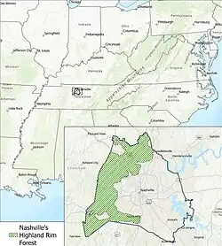 The Nashville Highland Rim Forest (NHRF) is an urban forest and geobiological area within the combined city-county limits of Metropolitan Nashville, Tennessee.[1] The forest consists of a distinctive, nearly continuous, mature hardwood tree canopy in an area of steep to moderate slopes and rugged topography. It is located on a rim of hills that encircles the Central Basin in which Nashville sits. NHRF is situated on the eastern escarpment of a larger, multi-county expanse of elevated uplands that form the Western Highland Rim physiographic region and ecoregion.[1][2] The NHRF covers an area of 97,000 acres. Four other urban forests that currently claim to be among the "world's largest" urban forests sum to a total of less than half the size of NHRF.[3] Consequently, NHRF appears to be the largest urban forest within the city limits of any major city (population >500,000) in the world.[4][5]