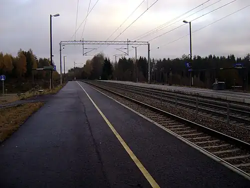 The intermediate stations between Lahti and Kouvola are also served by all but one Z rush hour service on the route Helsinki–Lahti–Kouvola.[6] The station does not have ticket sale services nor a VR ticket vending machine, though it does have 55 centimetres (22 in) high platforms, allowing accessible entry to low-floor trains.[7]