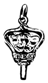 The Pi Epsilon Delta membership emblem was a key that included the comedy and drama masks of ancient Greek theater and the Greek letters ΠΕΔ.[4][6] Founding member Frances Allen Tucker designed the key. Its motto was Palamay en Drama or "Art in Drama".[6]