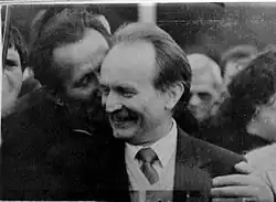 Kravchuk initially sought out the support of National Democrats in governance, but these attempts were rejected by many of the movement's more radical voices, such as Chornovil, who had no intention of working with an ex-communist politician. Pragmatists such as Ivan Drach, Mykhailo Horyn, and Volodymyr Yavorivsky (among others) formed the Congress of National Democratic Forces in an effort to further support for Kravchuk.[7] Following the victory of "red director" Leonid Kuchma in the 1994 Ukrainian presidential election, however, Chornovil originally fought to maintain relevance by working alongside Kuchma as "constructive opposition".[5] Despite this, Kuchma actively worked against the National Democrats, exploiting divisions between Rukh and other nationalist parties such as the Congress of Ukrainian Nationalists and Ukrainian Republican Party to the benefit of the Communist Party of Ukraine during the 1998 Ukrainian parliamentary election.[6]
