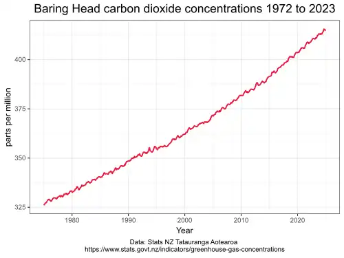 Atmospheric Carbon Dioxide Record from Baring Head, Wellington from 1977.